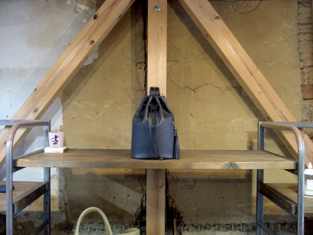 画像はオーダーで製作した一点。シボの型押しが施されたイタリアンレザー、ショルダーストラップなし、肩に掛けられるロングハンドル、上部中央にはホットスタンピング(焼印)によるイニシャル入り。