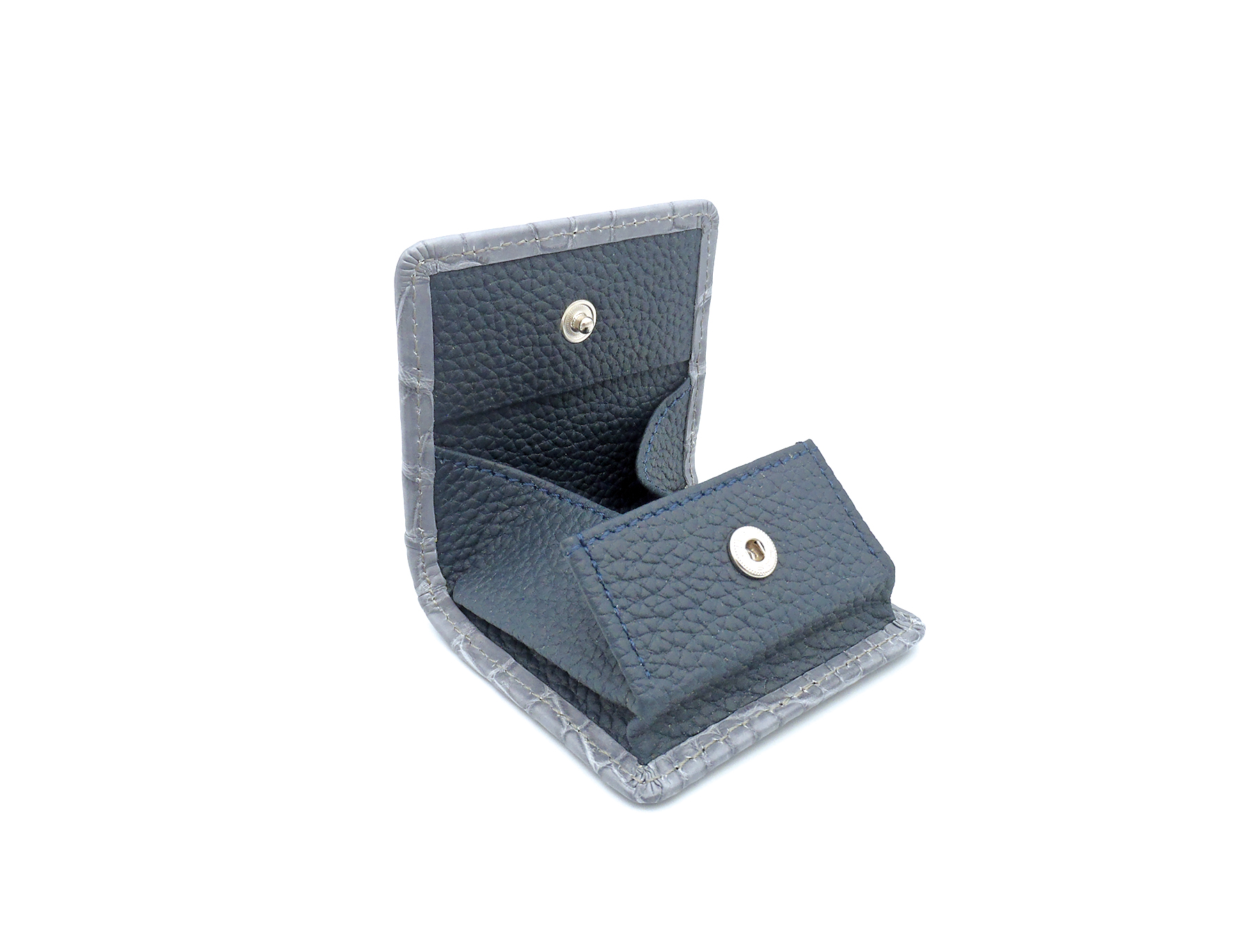 牛革 / グレー牛ヌバック / ネイビークロコダイル / グレーH:約7.5cm(開時15㎝) W:約11cm 大きく開くマチで一枚ずつ取り出しやすい名刺ケースかぶせの切り替え部分がポケットになっており、名刺交…