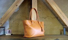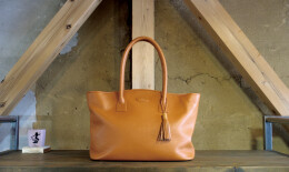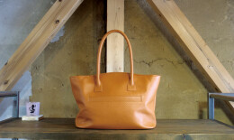 画像はオーダーで製作した一点。シボの型押しが施されたイタリアンレザー、ショルダーストラップなし、肩に掛けられるロングハンドル、上部中央にはホットスタンピング(焼印)によるイニシャル入り。