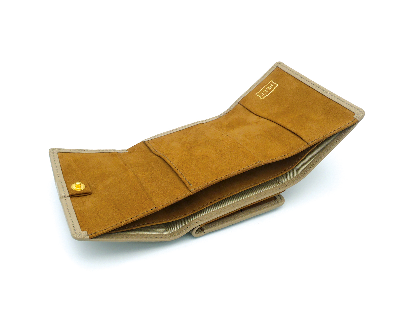 コンパクトな三つ折り財布。カードポケットは小銭れの下にもあり、5ヶ所の収納。